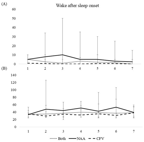 3.3.2. Wake after Sleep Onset, Time in Bed, Total Sleep Time, and Sleep Efficiency