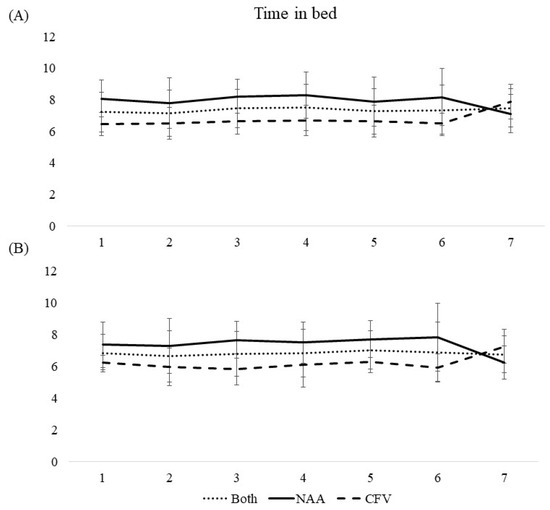 Mean scores of time in bed during a 7-day workweek among pilots in the Norwegian Air Ambulance (NAA; n = 25), Christophorus Flugrettungverein (CFV; n = 22), and both groups collapsed, measured by (A) sleep diary and (B) actigraphy. Error bars represent standard deviations.