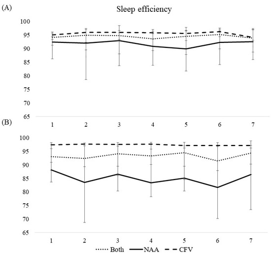 Median scores of sleep efficiency during a 7-day workweek among pilots in the Norwegian Air Ambulance (NAA; n = 25), Christophorus Flugrettungverein (CFV; n = 22), and both groups collapsed, measured by (A) sleep diary and (B) actigraphy. Error bars represent quartiles.
