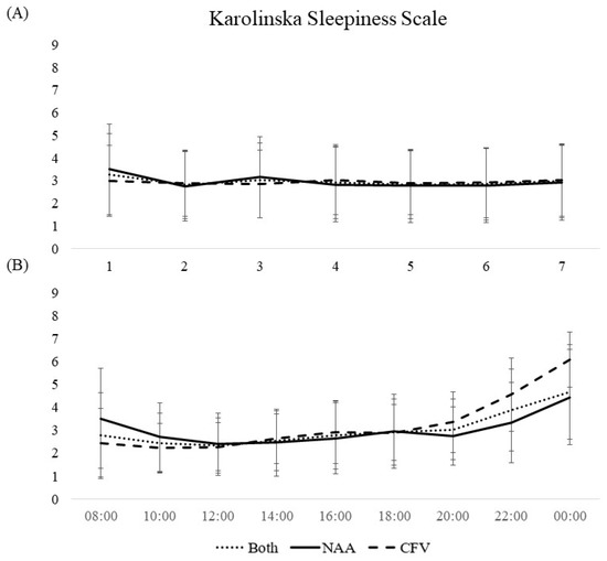 Mean scores of Karolinska Sleepiness Scale among pilots in the Norwegian Air Ambulance (NAA; n = 25), Christophorus Flugrettungverein (CFV; n = 22), and both groups collapsed. (A) During a 7-day workweek and (B) between 08:00–00:00 on workdays. Error bars represent standard deviation.