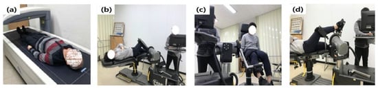 After explaining the procedure and purpose of this study to the participants, they consented to the test. To collect body composition information, their height and weight were measured. The participants’ thighs and ankles were secured with a fixing band in a state where they did not move once lying down on the examination table and looking at the ceiling, with their lower extremity joint BMD being measured using the Dual Energy X-ray Absorptiometry (DEXA, QDR-1000; Hologic, Waltham, MA, USA) equipment. Their chest, abdomen, and thigh were held with a fixing band to measure their maximum lower extremity joint strength. There was no movement in the other joints except in the observed joints upon matching the dynamometer axis and joint using isokinetic exercise (Humac Norm, Stoughton, MA, USA), as shown in Figure 1 [34]. The hip joint extension (gluteus maximus) and flexion (iliopsoas), knee joint extension (quadriceps) and flexion (hamstrings), and ankle joint dorsiflexion (tibialis anterior) and plantar flexion (gastrocnemius) were measured once, setting the angle and speed at 60°/s each time. In doing so, practices were performed three times, and peak torque was measured five times. To prevent fatigue, break time was given between measurements, while a loud voice offered motivation to exert maximum strength upon measurement.