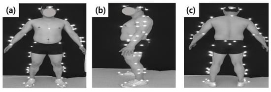 Reflective markers on the body: (a) frontal view, (b) lateral view, (c) backward view.