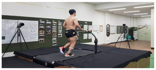After performing a warm-up, the participants wore upper and lower tights for the motion capture test, and 64 reflective markers were attached to the body (Figure 2). They wore personal standard running shoes, and the standing calibration was carried out to ensure the participant’s body anatomical position before the running’s measurement. Eight infrared cameras (Oqus 300, Qualisys, Sweden) captured the running motions. The sampling frequency was set at 100 Hz. They ran on a treadmill embedded with two force plates (Instrumented treadmill, Bertec, corporation, Columbus, OH, USA), and the sampling rate was set at 1000 Hz. After sufficient rest to minimize muscle fatigue, measurement was carried out by gradually increasing speed for five minutes to induce natural running before the measurement. The running speed was set at 3.1 m/s [26]. During their run on the treadmill with a selected speed of five minutes, the motion was collected from 30 gait cycles of the right leg (Figure 3).
