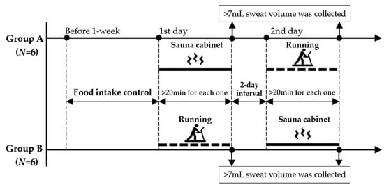To prevent cumulative fatigue, the tests were separated by a two-day interval and were performed in a counter-balanced arrangement. During testing, the 12 participants were randomly divided into 2 groups (groups A and B), comprising 6 participants each. On the first day, the participants in groups A and B were asked to perform dynamic running and sauna cabinet sitting trials, respectively, for collecting sweat samples of 7 mL (Figure 1). On the second day, groups A and B performed sauna cabinet sitting and dynamic running trials, respectively. A total of 24 sweat samples were collected (12 participants × 2 sweating conditions).