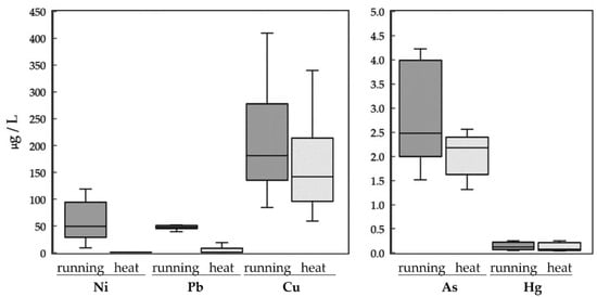 The results demonstrated that the sweating method influenced the excretion of heavy metals in sweat and, as hypothesized, the concentrations of Ni, Pb, Cu, and As were significantly higher during dynamic running than during sitting in the sauna. After strenuous exercise, sweat has generally a higher capacity than urine to remove heavy metals from the body. Tang et al. demonstrated that dynamic exercise can not only considerably affect the balance of trace elements but can also effectively remove toxic heavy metals from the body and reduce the accumulation of trace heavy metals []. However, that study only investigated the sweating condition of dynamic exercise. We employed previously, the same two conditions as those used in this study to investigate the excretion of urea, uric acid, and electrolytes in collected sweat samples; and discovered that the secretions of urea and K+ were significantly higher during running than during inactive overheating []. Although the concerned sweat composition in this study was different from our previous study, the current findings revealed significant differences in the concentrations of heavy metals in sweat between dynamic exercise and static thermal conditions.