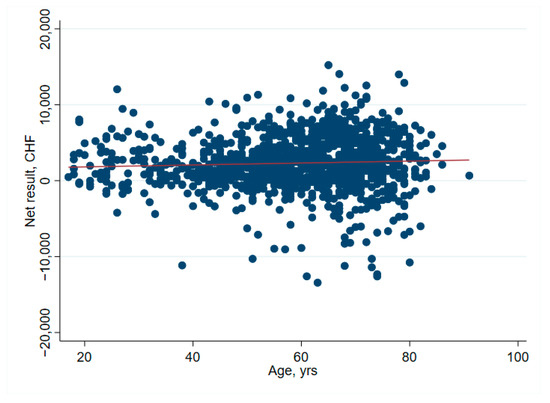 Correlation between age and net financial results. The red line indicates the fitted values.
