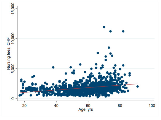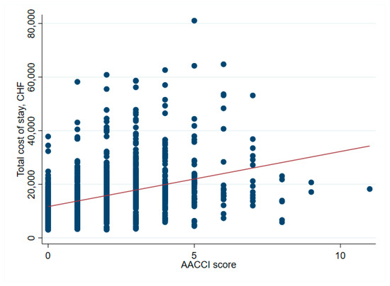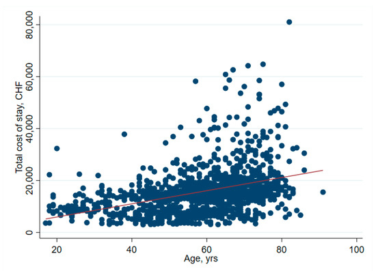 There was no significant association between net financial results and age (p = 0.61) (Table 2 and Figure 1). In hip surgery, however, earnings decreased by CHF 22 per year of patient age (adjusted for connective tissue disease, no comorbidities and cost weight) (Table 3), but the interpretation of such subgroup analysis should be made with caution. Older age increased the total cost of stay (Figure 2), partly due to higher nursing costs (Figure 3) and longer LOS (Figure 4). As expected, older age was associated with a higher cost weight (Figure 5) and a higher AACCI (Figure 6), representing the more multimorbid older population. Similarly, costs and AACCI scores were also correlated (Figure 7).
