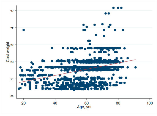Correlation between age and cost weight. Cost weight increases proportionally with age, indicating the increased burden of treatment and comorbidities associated with older patients.