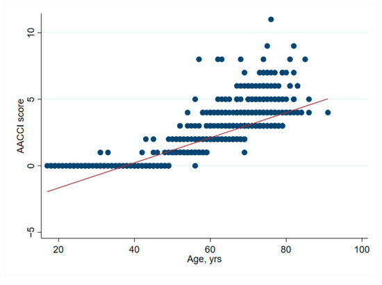 Correlation between age and the age-adjusted Charlston Comorbidity Index. This correlation is logical, as the score adds one point per 10 years after 50 years.