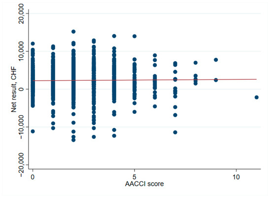 Patient factors associated with unprofitable outcomes were: (1) Female sex with 63% (151 of 240 unprofitable cases) vs. 50% males (492 of 990 profitable cases), p < 0.001, and (2) Diabetes with 10% (25 of 240 unprofitable cases) vs. 5.7% (56 of 990 profitable cases), p = 0.013. (Table 1). Patients categorized as “healthy”-defined by the absence of diabetes, heart disease, chronic obstructive pulmonary disease (COPD), cerebrovascular, or liver disease-were more often profitable with 85% (840 of 990 patients) vs. 78% (187 of 240 patients), p = 0.012 (Table 1). This classification into “healthy” was chosen to better account for major current comorbidities. Nevertheless, no association could be found between the AACCI score and net financial result (median AACCI score 2 in profitable and unprofitable cases) (Table 2 and Figure 8).