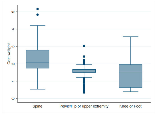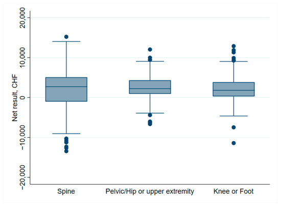 Orthopedic sub-specialties and their association with net financial results are indicated in Table 1. Spine surgery, shoulder arthroplasty, knee revision and foot surgery, in particular, were associated with negative net financial results. Moreover, the cost weight in spine surgery showed both higher median and variability than in other surgery types, as illustrated in Figure 9. Surgical factors associated with profitability were primary hip and knee surgery (incl. primary TKA and knee arthroscopy). The distribution of net financial results in relation to the surgical site is detailed in Figure 10.