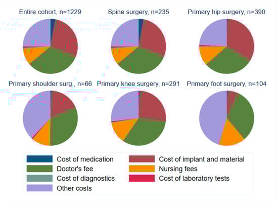 Table 4 shows cost units and their distribution between the “no deficit” and “cost deficit” groups. Associated with unprofitable cases were notably higher nursing and peri-interventional costs. In contrast, cost points associated with profitable cases were a higher doctor’s fee. Figure 11 provides an overview of relative cost distributions. Major cost points are implants, personnel costs and doctor’s fees. Variation occurs between prosthetic surgery and orthopedic sub-specialties using fewer implants.