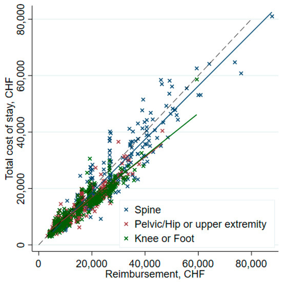 Furthermore, a higher cost weight (1.7 [1.2–2.0] vs. 1.0 [0.63–2.0]) was observed in profitable cases, p < 0.001. LOS was longer in unprofitable patients (5 days [4–7] vs. 4 days [3–5], p < 0.001) (Table 5). The DRG projected LOS was also lower in unprofitable patients (5.7 days [2.9–7.9] vs. 7.6 days [6.0–7.9]. In summary, unprofitable patients had an actual LOS approaching the DRG projected LOS (5 vs 5.7 days). The relation between costs and reimbursements for the various surgery types is shown in Figure 12. In general, costs and reimbursement are proportional and the hospital is able to make some profit (as indicated by the lines on the “reimbursement” side of the dashed line (right side). The illustration also indicates that spine surgery has less margin in general.