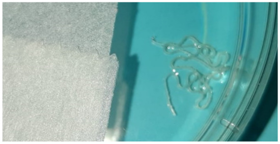 A clinical examination revealed mild spherical swelling of the lower lip approximately 5 mm in diameter, and a clinical diagnosis of mucocele was established. The change was slightly hard on palpation, indicating an excisional biopsy was required. The patient received local anaesthesia and surgery started. During the procedure, a long thin formation was extracted, and we assumed it was a parasite. The parasite was structureless, measuring 12 cm in length and 0.5 mm in diameter, with a greyish-white colour. The wound of the lower lip after surgery is shown in Figure 1; two sutures were placed at the site. We put the parasite into saline in a Petri dish (Figure 2) and delivered it to the University Hospital for Infectious Diseases, Zagreb, Croatia, immediately. Macroscopic and microscopic analysis showed that it was Dirofilaria repens.