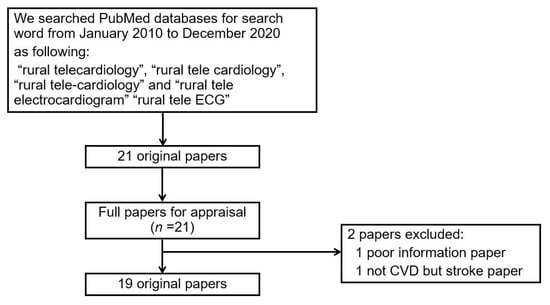 For this review, experienced reviewers carried out the search to identify the titles and abstracts of potentially relevant studies []. Each abstract was assessed independently by two reviewers (T. Y. and K. K.). We used PubMed databases for the search of studies published from January 2010 to December 2020 in the English language using the following keywords: “rural telecardiology”, “rural tele cardiology”, “rural tele-cardiology”, “rural tele electrocardiogram”, and “rural tele ECG” (Figure 1). We selected total 21 original articles excluding reviews or meta-analyses and duplicate papers (rural telecardiology, 15 articles; rural tele cardiology, 11; rural tele-cardiology 3; rural tele electrocardiogram, 11; rural tele ECG, 12). If at least one of the reviewers considered a reference to be eligible, the article was obtained in its entirety. Both reviewers then independently analyzed the articles to select the ones to be included in the review. In the case of a disagreement, the decision was made by the authors’ consensus. Our study followed an interpretive analysis of the updated Preferred Reporting Items for Systematic reviews and Meta-Analyses (PRISMA) statement to promote evidence-based medicine []. We also performed a manual tracking of citations of the selected articles. We excluded two papers: one paper lacked information, and the other one paper reported on strokes with a clinical application perspective. Consequently, we identified 19 original papers eligible for the review.