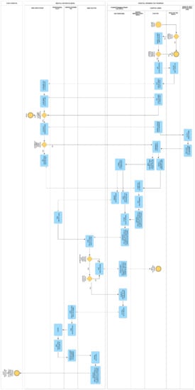 Interhospital patient transfer is complex and involves several stages, including internal transfer between the hospital ward and the HED, transport of the patient from the HED to the helicopter, patient transit and the transfer to the target hospital. As part of these operations, a number of medical interventions (preparatory, stabilising and qualifying) are undertaken, which constitutes the premises for decisions on subsequent stages of the process. All operations must be adequately documented. The analysed patient transfer process was illustrated using the Adonis program (Figure 1). Combining semantic technologies with Management Information Systems based on Business Process Management Notation (BPMN) is useful in the public sector due to the large amount of information that can be shared [71]. The Adonis BPMN tool has previously been used in the healthcare sector to support discrete-event simulation [72].