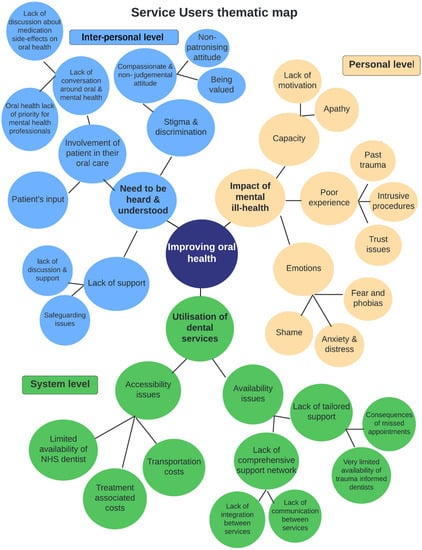 Thematic map of service users’ perspectives on barriers to improving oral health in people with severe mental illness at personal, inter-personal and system levels.