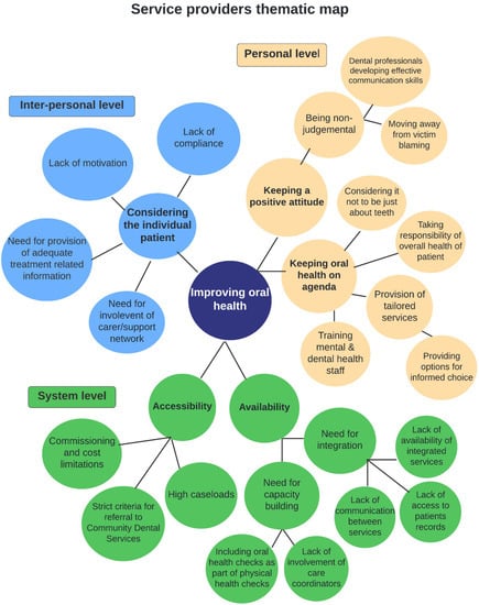 The study aimed to explore the barriers and facilitators for the maintenance of oral health and dental service use by people with SMI, informal carers and service providers. Themes were identified and classed at three levels—personal, inter-personal and system levels—to provide an understanding of how the barriers and facilitators can be addressed to provide the best possible care and support through the development and testing of a comprehensive intervention. When discussing with the stakeholders, they agreed with the study findings and recommendations.