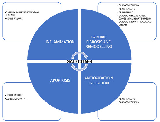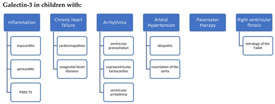 In the pediatric population, apart from the cardiovascular diseases discussed below, galectin-3 was studied in a variety of illnesses; one example of which was children with hepatitis B, proving that serum galectin-3 levels may be a beneficial indicator of chronicity of hepatitis B infection in children [8]. Borges et al. [9] demonstrated that the evaluation of galectin-3 is helpful in establishing differential diagnoses among pediatric posterior fossa tumors, based on the fact that galectin-3 is highly expressed in several tumors, including brain neoplasms. Moreover, some authors suggest that the expression of galectin-3 in nephrotic syndrome glomerulopathies in children could be regarded in certain individuals as an indicator of an unfavorable prognosis [10]. Significantly higher levels of galectin-3 were also found in patients with osteosarcoma, and the authors assume that serum galectin-3 could serve as a useful biomarker for the evaluation of osteosarcoma progression [11]. What is more, follow-up case-controlled study results by Ezzat et al. [12], suggest that serum galectin-3 levels can indicate activity, severity and progression of juvenile idiopathic arthritis in the pediatric population. Furthermore, the prognostic value of serum galectin-3 in children with sickle cell diseases was assessed in two studies suggesting that galectin-3 can be indicative of myocardial ischemia during vaso-occlusive crisis and a susceptibility factor for vaso-occlusive crisis frequency [13,14].