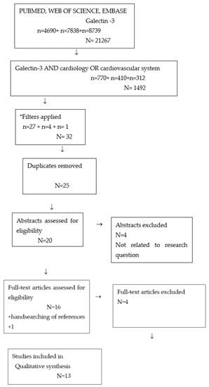 The authors performed a comprehensive search according to the Preferred Reporting Items for Systematic Reviews and Meta—Analyses Extension for Scoping Reviews (PRISMA-ScR)—Figure 2. An overview of the terms “galectin-3” AND “cardiology” OR “cardiovascular system” in databases such as PubMed, Web of Science and Embase was conducted. All types of studies meeting the following inclusion criteria were searched: articles in Polish and English, population 0–18 years old. The following exclusion criteria were applied: systematic reviews, metanalyses, case studies, articles published before 2014, research in animals. After excluding duplicates, 20 abstracts were assessed for eligibility. Subsequently, 16 full-text articles were studied, out of which 12 were selected for qualitative analysis. Supplemental handsearching of references provided one additional source. The selected studies were analyzed independently by all researchers. We resolved disagreements on study selection and data extraction by discussion if needed. We selected all the publications concerning galectin-3 in cardiovascular diseases. We excluded articles from the same centers with similar numbers of patients, and also articles with inconsistency in the numerical data. All the studies included in the review were prospective studies (Table S1).