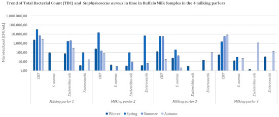Trend of Total Bacterial Count (TBC), Staphylococcus aureus, Escherichia coli, and Enterococci load in time in buffalo milk samples collected from the 4 buffalo milking parlors involved in the study (CFU = Colony Forming Unit; cm2 = sampled surface; CBT = Total Bacterial Count).