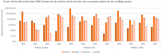 The analysis also involved the exposure to bacteria for milking parlors’ employees through contact with the buffaloes, and the matrices with whom animals were in contact (milking clusters, milking lanes, and buffalo udders) (Figure 2): TBC values from Milking Parlor 1 (MP1) were higher (>105 CFU/100 cm2) than those evidenced in MP2, MP3, and MP4 (<105 CFU/100 cm2), especially during the spring season, while the trend decreased in the summer and autumn of 2020. Nonetheless, European guidelines, Regulation (EC) No 853/2004, set the limits of total bacterial count (at 30 °C) of raw milk from bovine species, excluding cow milk, at a range between 500,000 and 1,5 million CFU/mL [37].