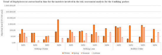 Thus, as well as with milk samples, total microbial load values higher than 104 CFU/100 cm2 were registered in the surface samples of equipment and udders of buffaloes involved in the MP1 (Figure 2), in some cases corresponding to a higher isolation rate of coagulase-positive Staphylococcus spp. (Figure 3). As for milking clusters, the highest microbial loads of coagulase-positive Staphylococcus spp. (Staphylococcus aureus) were evidenced in MP4; elevated values of the pathogen were registered in the samples collected from the milking lanes of MP3 and MP4, mostly in the spring season (Figure 3).