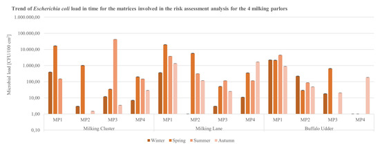 Milk samples’ data evaluation allowed the seasonal comparison of the total bacterial count (TBC) values and coagulase-positive Staphylococcus spp., E. coli, and Enterococci microbial loads. Analysis of the results presumably evidenced a potential risk for workers to contract a zoonosis (mainly connected to S. aureus infections) predominantly during the winter and spring seasons (Figure 1). The highest microbial load values for TBC, contamination indicators, and coagulase-positive Staphylococcus spp. were registered in Milking Parlor 1 (MP1). It was indeed evident that the actions pointed at reducing the exposure for milking parlors’ workers should be primarily taken mainly during the two seasons resulted in the evaluation (Figure 1).