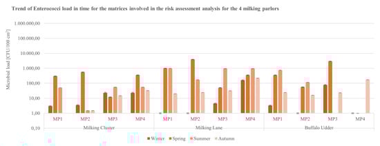 Data for the contamination indicators E. coli (Figure 4) and Enterococci (Figure 5), with regards to the matrices in contact with the animals (milking clusters and milking lanes), reported microbial loads of the parameters higher than 103 CFU/100 cm2 exclusively on milking clusters’ specimens sampled in MP4 during the spring season (Figure 4).