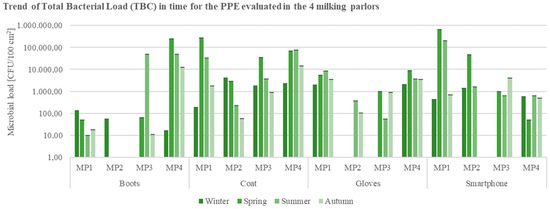 The evaluation of the workers’ safety in the milking parlors involved in the research, with respect to the monitoring of the PPEs during the assessment period, evidenced elevated microbial loads mainly during the summer and spring seasons. In particular, data regarding surface samples of boots, coats, and gloves from MP4, in the warmest seasons, brought out total bacterial counts values ≥104 CFU/100 cm2 (Figure 6).