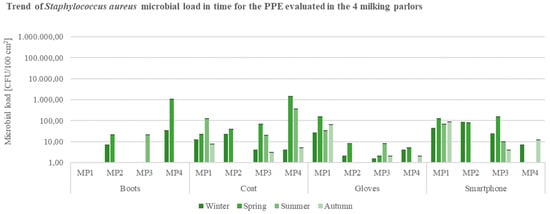 Coagulase-positive Staphylococcus spp. (S. aureus) evaluation allowed to suppose the identification of coats and smartphones as the most contaminated samples, with a substantial decrease in autumn in the totality of milking parlors. TBC and S. aureus counts of boots surface samples from MP1, MP3, and MP3 were the lowest registered: contamination indicators were mostly absent in the summer and winter (Figure 7).