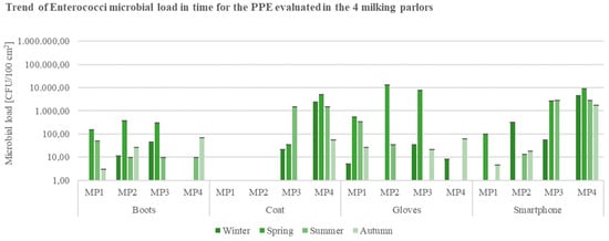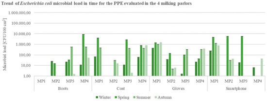 Values of E. coli (Figure 8) for PPEs samples resulted higher than 103 CFU/cm2 mainly in the spring season. Boots’ and coats’ surfaces of employees from MP3 and MP4 presented the highest loads of the indicator microorganism, with a substantial reduction in autumn. Gloves’ and smartphones’ surface specimens sampled from MP1 evidenced high microbial loads (Figure 8).