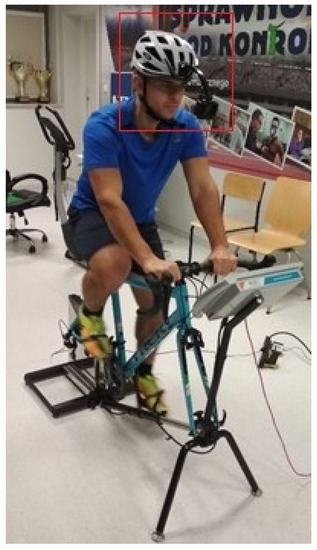 The test was conducted under laboratory conditions, where the temperature was 19 C, and the lighting was constant during all measurements. During the test, windows and doors were closed to avoid wind gusts and to eliminate other external factors affecting blink frequency. There was only one subject and two investigators in the room so that the subject was not distracted by the others. The progressive test of oxygen use was conducted using a bicycle ergometer with Cyclus2 software, with the latter being used to establish the appropriate test protocol and the analysis of data. To capture the blink rate, a GoPro camera was attached to the helmet of the subject and directed towards their eyes (Figure 1), set to register the images during the test at a resolution of 760p and a with frame rate of 60 fps.