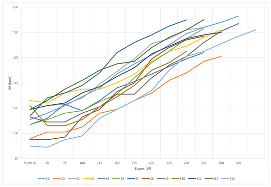 The relationship between heart rate and stages; S1:S13—research subjects.