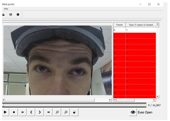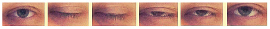 The records were transferred to a computer, where the frame rate was reduced to 20 fps. The time of the closed eye was determined by summing the number of frames in which the closed eye occurred. One frame corresponded to 0.017 s. The MarkBlinks program (Figure 3) was prepared by the authors for the purpose of counting blinks, frame by frame. A 1 signified “eye open”, and a 0 signified “eye closed”. Pictures 1 and 6 show open eye, and pictures 2–5 show closed eye (Figure 4). The “eye open” condition was set when no more than half of the pupil was obscured; otherwise, the eye was classified as closed. This was a subjective assessment by the person who checked the recordings.
