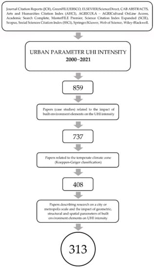 The bibliographic query was carried out to limit the number of scientific articles to those that most fully describe the impact of modulating individual parameters of elements of urban space on UHI. Therefore, only case studies from the temperate zone of the last 2 decades were included in the presented review paper.