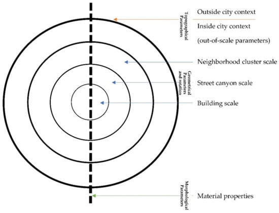 To better understand the spatial and microclimatic relationships occurring in an urban unit, it is worth applying the islands’ theory in terms of landscape. For this reason, this chapter’s sections are logically divided into four scales corresponding with three different landscape formations with a significant impact on the microclimate. The scales are hierarchical, and each item lower in the hierarchy is a component of a higher scale (Figure 2). The smallest scale is related to the properties of materials, i.e., the basic physical building blocks. It is related to morphological parameters and describes the quality through the properties of materials that make up elements and objects at various scales. It is problematic to classify the parameters responsible for anthropogenic emission. They define the de-facto quality of the space and have also been classified into the family of morphological parameters. Higher in the hierarchy, a building corresponds logically to the tree. The third scale, or city canyon, is made of the buildings and the street layout, just as trees and the river make up the valley. The fourth and last scale corresponds to the neighborhood unit, where buildings, streets, and other elements of the urban environment create complex spatial patterns, as well as biotic and abiotic components in a forest massif. These three scales represent a variety of geometric family parameters. There are significant differences in the types of parameters, as well as in the different distribution of the parameters’ dominance in the family. The geometrical parameters family describes quantitative parameters (mathematically countable) synonymous with length, width, height, area, volume, distribution density, percentage, area, and interrelationships. Extra scale, there are also universal temperature modulators, identical for the elements and responsible for the energy balance, determining the function of space, the geometry of the entire unit, and the external factors that influence the objects on the scale. It is the most problematic scale closely related to the group of topographic parameters. Its problems result from the inability to assign to the scale because, depending on the hierarchical level of the scale, individual geometric parameters become topographic. In this way, on the scale of the estate, all geometric parameters for the entire city become topographic parameters for the estate because they become external factors—the context.