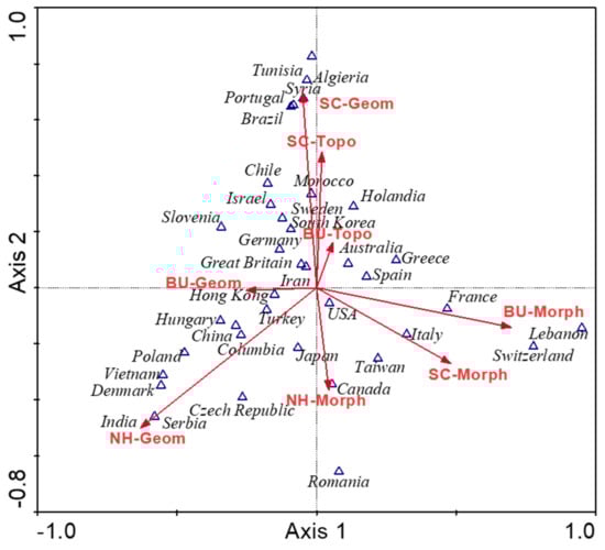 The CCA analysis showed that the most frequently described UE objects were the neighborhood cluster (NH) and street canyon (SC), as indicated by the exceptionally high F-values (Table 4). Both for the NH and SC, geometric parameters turned out to be significant, while for the BU, morphological parameters turned out to be substantial. Most often, information on the UE elements influencing UHI propagation can be found in the papers with examples from China, Italy, the USA, Greece, Germany, and France. The distribution of publications depending on the country of origin is very scattered. However, some dependencies can be found. The most frequently described geometric and topographic parameters for the street canyons were in Brazilian, Portuguese, Syrian, Algerian, and Tunisian research papers. In Indian, Serbian, Danish, Vietnamese, Polish, and Czech papers, elements related to the geometry of the neighborhood cluster were studied more often. Buildings, i.e., the smallest units, were the object of research in such countries as Italy, France, Switzerland, and Lebanon (Figure 4).