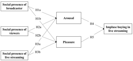 To address this question, we use the stimulus–organism–response (SOR) framework to conceptualize our theoretical model because the SOR framework provides a suitable lens to understanding the mechanism for impulse buying via social presence in live streaming. The SOR framework of environmental psychology was proposed by Mehrabian and Russell []. The SOR framework suggests that some environmental aspects resulted in certain behavioral outcomes through provoking an individual’s emotional and cognitive conditions. Therefore, it was widely used in the research of consumer behaviors in the marketing and information system disciplines []. The SOR framework consists of three components: stimulus, organism, and response. In our research, the social presence that captures the overall virtual experience within live streaming e-commerce is the stimulus in our model. Some research used a single dimensional to conceptualize social presence. However, Song et al. [] and Lu et al. [] suggest that the unidimensional conceptualization of social presence is oversimplistic in the context of computer-based communication because individuals not only communicate with the medium but also interact with other participants (e.g., the sellers and other customers). Following the paper by Song et al. [], we used three dimensions to conceptualize social presence in live streaming: the social presence of the live streaming, the social presence of the broadcaster, and the social presence of the viewers. The organism is the customers’ affective and cognitive conditions. In our research, impulsive buying behavior is characterized by consumers’ emotional activation rather than cognitive factors []. Therefore, the emotional factors of pleasure and arousal are the organism. Specifically, pleasure refers to the degree to which individuals feel happy or satisfied, and arousal refers to the degree of stimulation caused by an atmosphere []. Third, impulse buying in live streaming is the response. Impulse buying refers to “a sudden and immediate purchase with no pre-shopping intentions either to buy the specific product category or to fulfill a specific buying task. The behavior occurs after experiencing an urge to buy and it tends to be spontaneous and without a lot of reflection” (i.e., it is “impulsive”) [,].