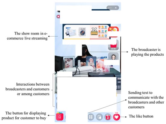 In typical live streaming e-commerce, the broadcaster can create and deliver real-time video to the customers. The broadcaster can engage potential audiences to join the live stream to consume the content. For example, the broadcasters can talk about the last beauty trend, introduce the product, and try on different items for the viewers. During the content consumption process, the viewers can also ask questions about the products, chat with the broadcaster and other viewers via text, and even send a virtual gift to their appreciated broadcasters. Compared with the traditional web-based e-commerce or social e-commerce, live streaming e-commerce can not only allow the customer to become closer to the products but also to hear the broadcaster describe how the product feels and watch the effect of the broadcaster try it on, thus fostering a more authentic and interactive online shopping experience [,]. Many customers could not help buying the product when watching live streaming e-commerce.