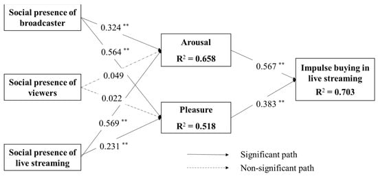 Furthermore, consistent with the current literature in both relational marketing and information systems [,], impulse buying in live streaming e-commerce can be predicted by customer arousal and pleasure. Through the multiple mediation analysis, we found that the social presence of viewers can only affect impulse buying indirectly via pleasure and arousal. In contrast, the social presence of the broadcaster and the social presence of the live streaming can affect impulse buying both directly and indirectly via pleasure and arousal. These findings have important theoretical and practical implications.