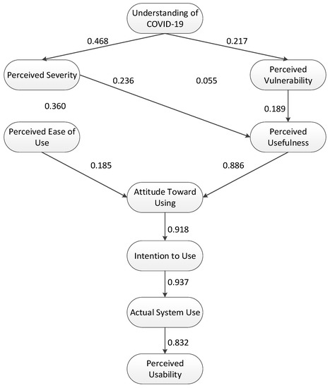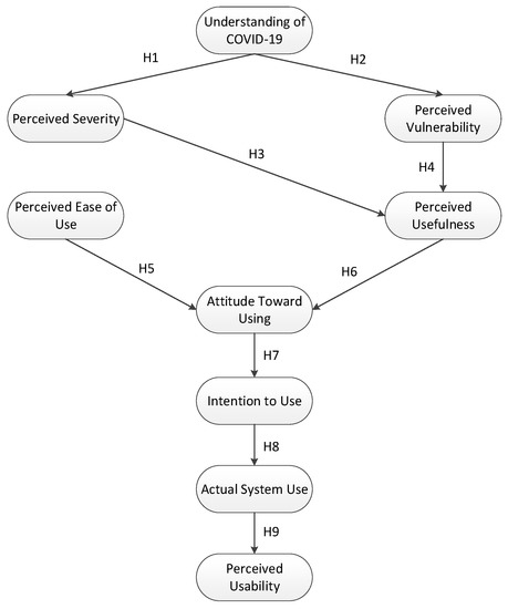 - Velicia-Martin, F.; Cabrera-Sanchez, J.P.; Gil-Cordero, E.; Palos-Sanchez, P.R. Researching COVID-19 tracing app acceptance: Incorporating theory from the technological acceptance model. PeerJ Comput. Sci. 2021, 7, e316. [Google Scholar] [CrossRef]