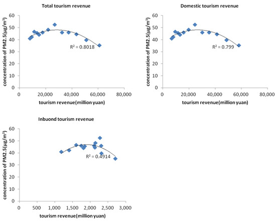 Scatter diagram of total/domestic/inbound tourism revenue and PM2.5 concentration.