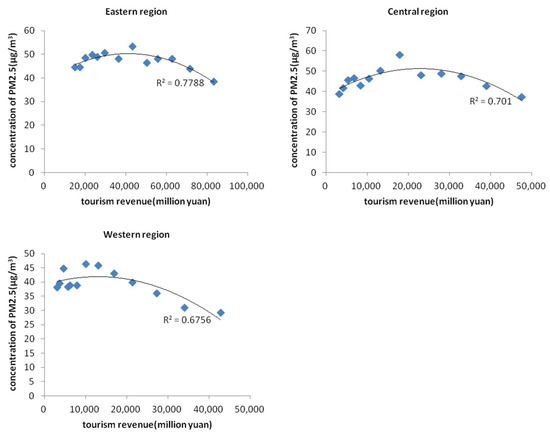 In order to verify whether the “environmental Kuznets curve” phenomenon in the process of economic development also exists in the tourism development in China, we used the time series data of the average of all cities’ air pollution data and tourism economic data from 2004 to 2016. The scatter plot of tourism income and PM2.5 concentration was drawn and fitted with the curve, and the results are shown in Figure 1 and Figure 2. Figure 1 shows the relationship between total tourism revenue, domestic tourist revenue, inbound tourist revenue and PM2.5 concentration, respectively. From the curve fitting R2, it is shown that there is a certain “inverted U-shaped” relationship between the development of the tourism economy in mainland China and PM2.5 emissions, which is generally significant. According to different sources of tourism revenue, the “inverted U-shaped” significance between domestic tourism revenue and PM2.5 emission mechanism is stronger than that of inbound tourists (the R2 value is larger). Figure 2 shows the scatter plot of the total tourism revenue and PM2.5 concentration in the eastern, central and western regions. It can be seen that there is also a certain “inverted U-shaped” relationship between the tourism economic development and PM2.5 emissions in the three regions.