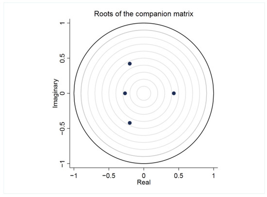 After the model is established, the stability should be tested to see whether it has economic significance. If the model is unstable, the impulse response function cannot be used to analyze the interaction between variables. We check whether the established PVAR model is stable according to the size of the reciprocal modulus of the AR characteristic root. When all of them are less than unit 1, it indicates that the established model is stable. The test results are shown in Figure 3. The modular lengths of the four characteristic roots are all less than 1—that is, the established PVAR model is stable.