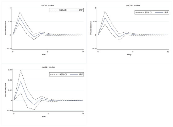 On the basis that PVAR satisfies stationarity, stability, and Granger causality, the dynamic impact of tourism economy on air pollution can be further analyzed by using the impulse response function (IRF). The results are shown in Figure 4, showing the impact of a one-standard deviation shock of Δln TR on Δln PM, and the solid line reflects the response of Δln PM to the change in Δln TR. The dotted line represents the 95% confidence interval obtained by 300 operations of the Monte Carlo method. It can be seen from Figure 3 that the impulse response function value is positive in the short term, and the 95% confidence interval is also positive. The positive function value indicates that the change in the tourism economy will cause the air pollution to change in the same direction in the short term. Then, the value of the impulse response function gradually declines, and approaches 0 when it lags behind three phases, and then it is basically stable. In other words, the tourism economy has the greatest positive impact on air pollution in the first period, and then gradually declines. After the third period, its impact is close to 0 and tends to be stable.