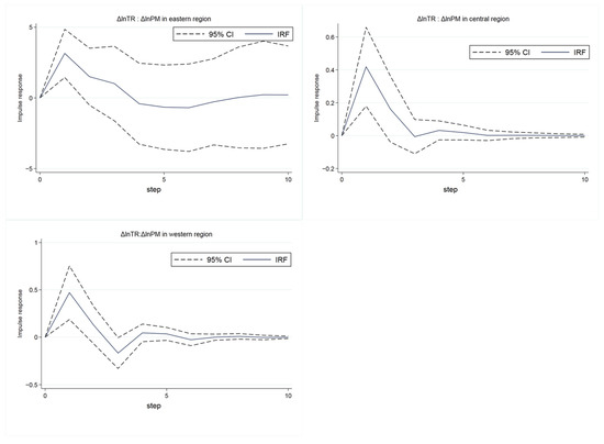 To explore the heterogeneity of the impact of tourism economy on air pollution in different regions, with reference to the division standard of the Bureau of Statistics, according to the geographical location, policy tendency and economic level, the cities are divided into eastern, central and western regions by region (the eastern region includes 12 provincial administrative units in Beijing, Tianjin, Hebei, Liaoning, Shanghai, Jiangsu, Zhejiang, Fujian, Shandong, Guangdong, Guangxi and Hainan; the central region includes nine provincial administrative units in Shanxi, Inner Mongolia, Jilin, Heilongjiang, Anhui, Jiangxi, Henan, Hubei and Hunan; the western region includes 10 provincial administrative units in Chongqing, Sichuan, Guizhou, Yunnan, Tibet, Shaanxi, Gansu, Ningxia, Qinghai and Xinjiang), and the PVAR model is constructed with the total tourism revenue as a variable. The results of the impulse response function are shown in Figure 5, which shows the effect of one standard deviation change in total tourism receipts on air pollution in three regions. The tourism economy in the eastern region has a greater impact on air pollution (the peak of the solid line is about 3, while in other regions the peak is less than 1), and the impact lasts for a longer period of time. This may be because the overall economy in the eastern region is more developed, tourism drives more tourism-affiliated industries and causes pollution, and people from economically developed regions are more likely to travel in private cars that are convenient and fast but consume more energy and pollute more. At the same time, the volatility of shocks in the eastern region is also greater, which may be due to the uneven development of first-tier cities and second- and third-tier cities in the eastern region.