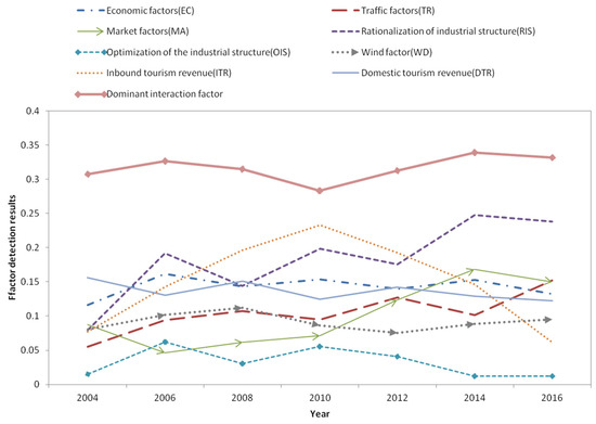 The overall impact of various factors on the tourism economy is analyzed above. Whether it is robust in each year still needs to be verified, so we use cross-sectional data to perform Geodetector analysis. As Figure 6 shows, the tourism economy of each region is one of the many factors affecting air pollution. The impact of inbound tourism on air pollution is relatively high, and has a trend of first rising and then falling, while the impact of domestic tourism on air pollution is generally unchanged. This may be the result of the joint action of economic and social development and the improvement of social environmental protection awareness. The influence of other single factors on the tourism economy is different. The impact of traffic factors, marketization factors, and industrial structure rationalization factors on air pollution is generally on the rise. The impact of economic factors on air pollution remains broadly unchanged. This shows that the impact of marketization and industrial structure on air pollution is becoming more and more critical. The rise in the influence of traffic factors may be the result of the increasing popularity of private cars. It can also be seen from Figure 4 that the overall impact of the interacting leading factors on the tourism economy is still greater than the impact of a single factor on the tourism economy, indicating that the “joint force” factor is still the dominant factor in the development of the regional tourism economy.