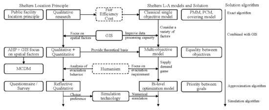 Throughout the history of shelter location and model development, the main objective of urban shelter site selection has been to achieve an “equalization of public services” within a limited budget. Scholars have always focused on this basic principle to strike a balance between fairness, efficiency, and cost (Figure 1, Table 2). The existing research can be divided into two categories. The first approach is to construct an L-A model and explore the model-solving algorithm by using operational research theory, which can accurately solve the problem of facilities’ location. However, solving the model is complex, and approximate intelligent algorithms such as genetic, iterative clustering, ant colony, and SAAs are often used. The second approach is to pay attention to the location principle and to determine the priority of shelter locations by using the MCDM that combines qualitative and quantitative methods. The conclusion can provide a theoretical basis for the optimization objective of the L-A model and location decision when the candidate sites are determined. Each of the above model methods has its own advantages, disadvantages, and application conditions. In contrast, the bi-level multi-objective L-A model is more suitable for the actual situation. The upper-level model considers the economy and fairness from the perspective of the government, while the lower-level model considers the accessibility from the perspective of the evacuees. However, at present, only the influence of the evacuation distance on the evacuees is considered.