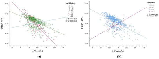 Plots showing interaction of natural log-transformed plasma arsenic (As) and SNPs. (a) Interactions with rs1800629 types AA and GG were not significant; however, rs1800629 AG significantly interacted with plasma As levels to decrease CKDEPI eGFR. (b) There were only CC and TC types for rs769176; the cross lines show a significant interaction between these types and plasma As levels. Participants with the TC type of rs76179 would be more robust to As exposure than CC carriers; however, the numbers were too small, and there were no participants with the TT type of rs769176.